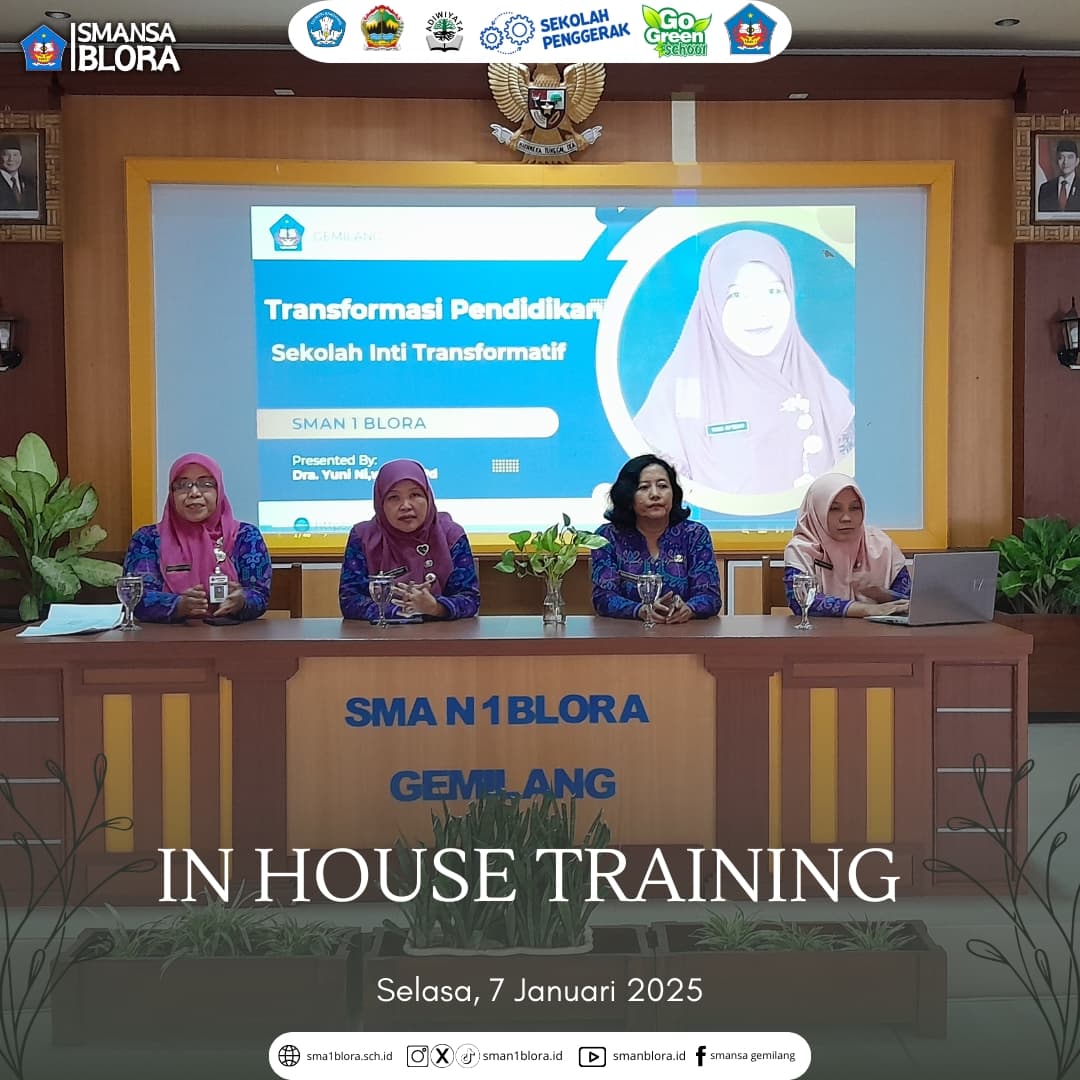 Selasa 7 Januari 2025 SMA Negeri 1 Blora melaksanakan kegiatan In House Training (IHT) dengan tema Sekolah Inti Transformatif. Kegiatan ini dilaksanakan di Aula dihadiri oleh Bapak Ibu Guru dan karyawan SMA Negeri 1 Blora dan juga menundang sekolah lain antara lain SMA Al Muhammad Cepu, SMA Muhammadiyah Cepu, SMA Negeri 1 Ngawen, SMA Katolik Cepu, SMA Muhammadiyah Kedungtuban, SMA Negeri 2 Blora, SMA Katolik Randublatung, SMA Muhammadiyah Todanan, SMA Negeri 1 Tunjungan, SMA Krida Doplang, SMA Mujahidin Randublatung, SMA Randublatung, SMA Miftahul Ulum Ngawen, SMA PGRI Cepu, SMA Negeri 1 Cepu, dan SMA Negeri 2 Cepu.
