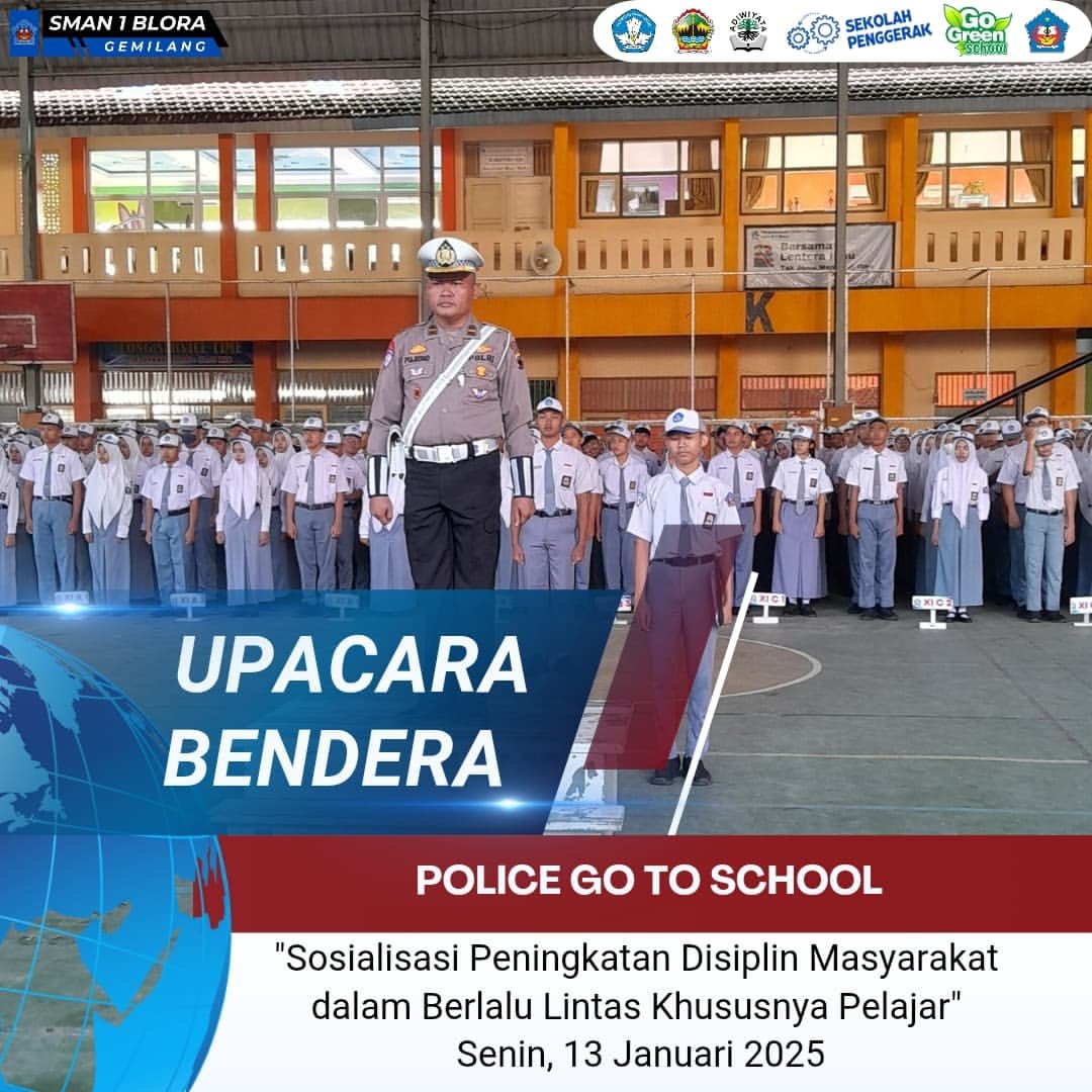 Upacara bendera dilaksanakan di Indoor SMA Negeri 1 Blora diikuti oleh semua warga sekolah. Bekerjasama dengan Satlantas Polres Blora melaksanakan kegiatan Police Go To School “ Sosialisasi Peningkatan Disiplin Masyarakat dalam Berlalu Lintas Khususnya Pelajar” di Wilayah Hukum Polres Blora dan bertugas sebagai Irup upacara Aiptu Pujiono, SH.Ps