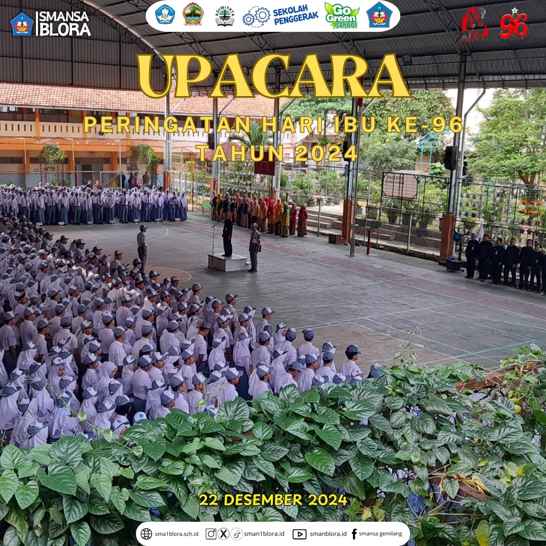 SMA Negeri 1 Blora melaksanakan Upacara Peringatan Hari Ibu (PHI) ke 96 di Indoor. Upacara ini di ikuti oleh Kepala SMA Negeri 1 Blora Dra. Yuni Ni’wati, M.Pd, tenaga pendidik, tenaga administrasi sekolah dan juga siswa siswi kelas X, XI, XII.